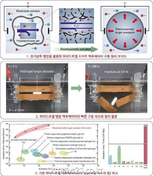 또한 외부 동력원으로 전기장을 활용하면, 삼투에 전기 삼투를 더 해 빠른 속도로 큰 힘을 발생하며 구동할 수 있다. 연구팀은 전기장을 활용해 무게 약 1g의 하이드로젤을 이용한 액추에이터로 2cm 두께의 벽돌을 5분 안에 부수는 것을 보여줬다.