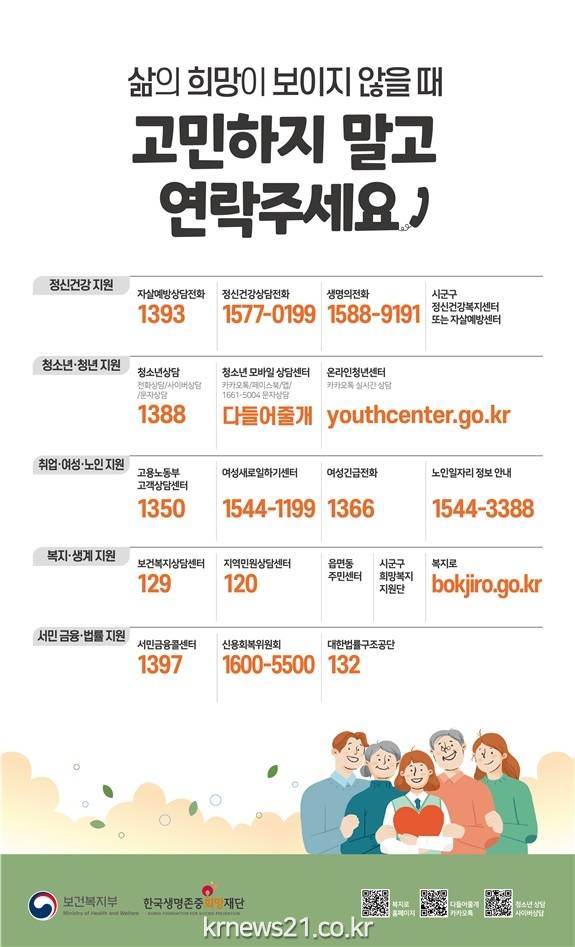 우울감 등 말하기 어려운 고민으로 전문가의 도움이 필요할 경우 광명시 자살예방센터(☎ 02-2618-8255), 보건복지부 희망의 전화(☎ 129). 정신건강 위기 상담전화(☎ 1577-0199), 자살예방 상담전화(☎ 1393)에 전화하면 상담을 받을 수 있다.
