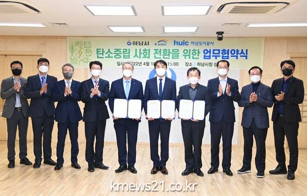 하남시, K-water(한국수자원공사), 하남도시공사는 18일 하남시청에서 3자간 탄소중립 사회전환을 위한 업무협약을 체결했다. 이날 협약식에는 김상호 시장을 비롯해 박재현 K-water 사장, 이학수 하남도시공사 사장 등이 참석했다.