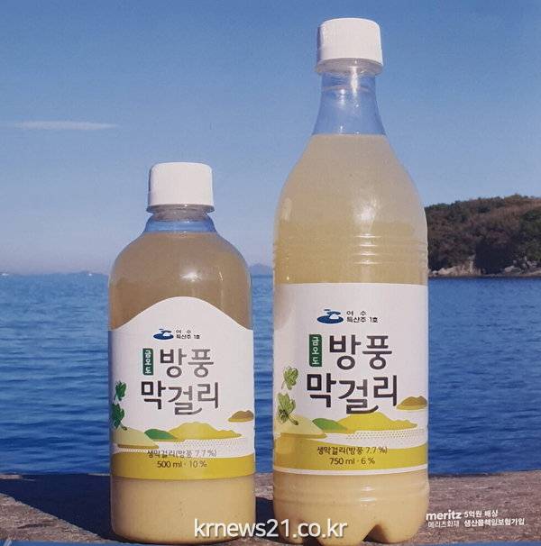 ‘금오도 방풍 막걸리’는 방풍 잎에서 추출한 즙을 7.7% 첨가한 생막걸리로, 알코올 함류량에 따라 6%인 750㎖와 10%인 500㎖ 2종이 생산된다.