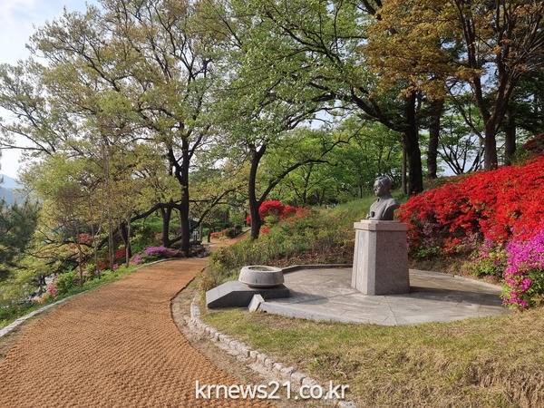 또한 체육공원 입구에서 산책로를 걷다 보면 새로 심은 수국 묘목(280주)과 기존에 가꾸어왔던 영산홍(700주)가 활짝 피어있고, 오는 여름에는 수국 꽃길을 걸을 수 있다.