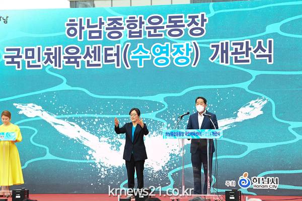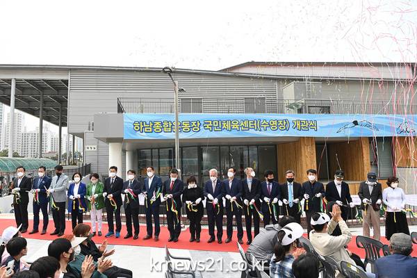 하남종합운동장 내에 있는 하남국민체육센터 수영장은 2020년 증축공사에 들어가 2년에 걸친 공사 끝에 이날 준공식을 가졌다. 기존 수영장은 25m 6레인으로 운영됐으나 이번에 50m 8레인을 추가해 경기도 내 2번째 규모가 됐다.