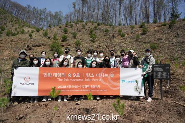 이번 인증서는 한화그룹이 트리플래닛과 함께 올 4월 20일 강원도 홍천군에 조성한 제9호 ‘태양의 숲’ 인증서로 태양의 숲은 2011년부터 사막화 방지, 미세먼지 저감 등 여러 환경 문제에 대응하고자 한화그룹이 트리플래닛과 함께 친환경 숲을 가꿔온 프로젝트다. 제9호 태양의 숲은 홍천군 내면 방내리 일대에 탄소 흡수력이 높은 소나무와 낙엽송 1만2000그루를 심었다. 묘목은 한화그룹이 기증한 태양광 설비를 이용해 화석 연료를 사용하지 않는 태양광 에너지로 길러진다.