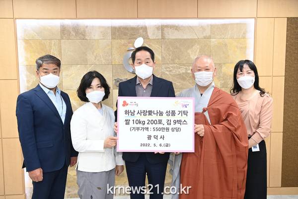 하남시는 광덕사에서 9일 ‘하남 사랑愛(애)나눔’ 성품으로 쌀 200포대(10kg 들이)와 김 9박스를 시에 기탁했다고 밝혔다.