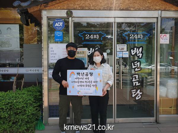 하남시 창우동 검단산 입구에 위치한 백년곰탕 이남호 사장은 지난 5월 3일 어린이날 100주년을 맞이하여 LH행복꿈터 미사강변지역아동센터(센터장 김길임)에 후원금을 전달하였다.