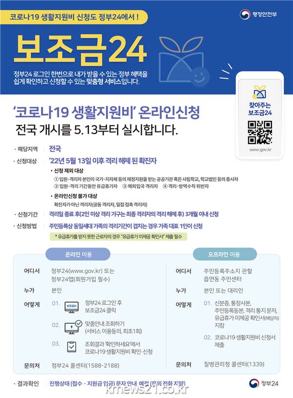 행정안전부와 질병관리청은 5월 13일(금)부터 정부24 누리집 또는 모바일앱을 통해 코로나19 확진자에 대한 ‘생활지원비 신청 온라인 서비스’를 개시한다고 밝혔다.