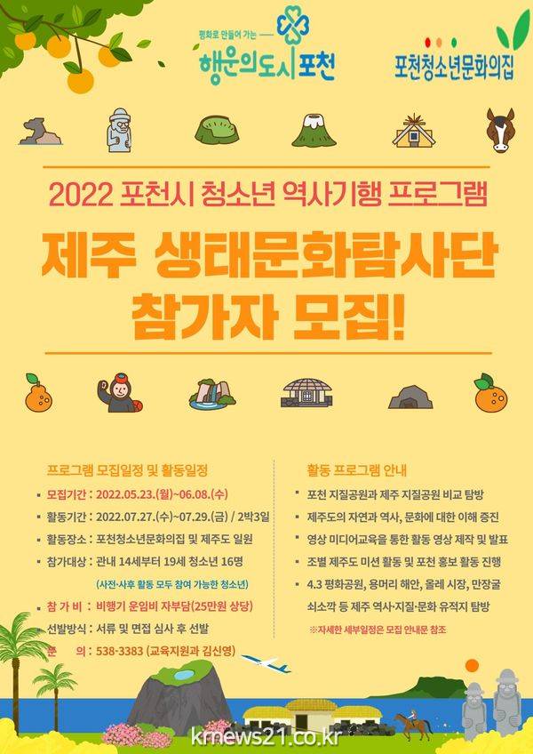 포천시는 오는 23일부터 6월 8일까지 관내 청소년을 대상으로 ‘제주 생태문화탐사단’ 참가자를 모집한다.