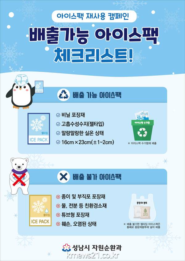 성남시 자원순환과 관계자는 “가정에서 버려지는 아이스팩을 모아 배출할 수 있도록 수거함을 확대 설치하고 제공 업체도 늘렸다”면서 “환경오염 예방과 생활 쓰레기 감축에 협조해 달라”고 말했다.