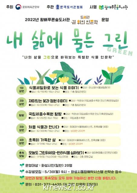 ▲ 사진=화성시립도서관화성시문화재단(대표이사 김종대)이 운영하는 동탄복합문화센터도서관과 왕배푸른숲도서관에서 2022년 ‘도서관 길 위의 인문학’ 공모사업을 유치, 6월부터 운영할 프로그램 참가자를 모집한다.