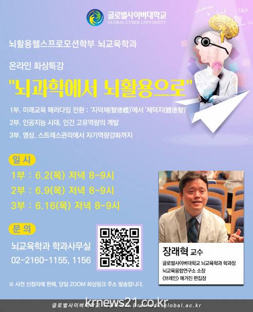 ▲ 사진=글로벌사이버대학교뇌교육 특성화 대학인 글로벌사이버대학교(총장 이승헌)는 일반 시민들의 뇌에 관한 관심도 증가에 부합하고자 6월 2일(목)을 시작으로 매주 목요일, 3회에 걸쳐 뇌교육 무료 특강을 개최한다고 30일 밝혔다.