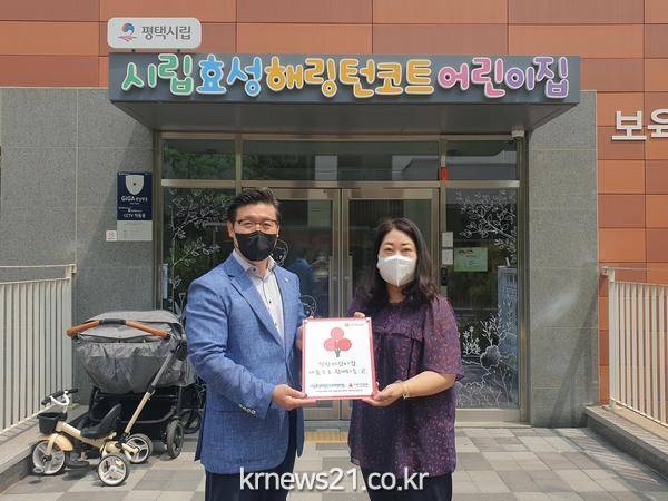 ▲ 사진=평택시청평택행복나눔본부는 지난 25일 시립효성해링턴코트어린이집(원장 김소영)에 착한 어린이집 현판을 전달했다.