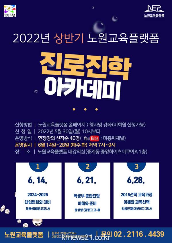 ▲ 사진=노원구청서울 노원구가 오는 6월 14일 화요일부터 28일까지 매주 화요일마다 입시 및 교육과정에 대한 궁금증을 해결해 줄 ‘2022년 상반기 진로진학 아카데미’를 개최한다고 밝혔다.