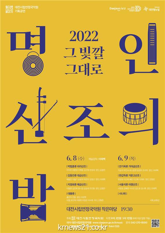 ▲ 사진=대전광역시대전시립연정국악원(이하 국악원)은 오는 6월 8일(수) · 9일 (목) 19시 30분 양일간 국내외 수준 높은 국악 명인들의 유파별 대표자들의 산조, 대풍류, 시나위 합주 등 전통 예술성이 뛰어난 프로그램을 바탕으로 한 ‘2022 명인 산조의 밤 그 빛깔 그대로’ 공연을 국악원 작은마당에서 개최한다.
