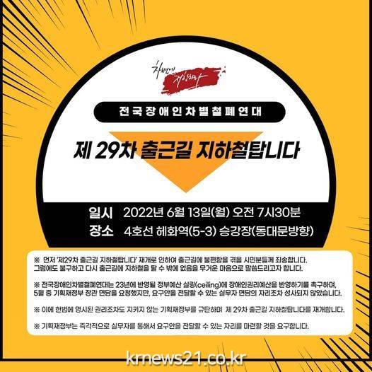 전장연은 “‘출근길 지하철탑니다’ 재개로 인해 출근길에 불편함을 겪을 시민분들에게 죄송하다”며 “2023년에 반영될 정부예산에 장애인권리예산을 반영하기를 촉구하며 5월 중 기획재정부 장관 면담을 요청했지만, 요구안을 전달할 수 있는 실무자 면담의 자리조차 성사되지 않았다”고 출근길 지하철 시위를 재개한 이유를 밝혔다.