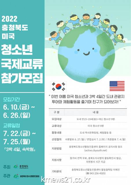 이번 사업은 미국 청소년 9명과 충청북도 청소년 9명을 대상으로 7월 22일부터 25일까지 3박 4일간 운영된다.