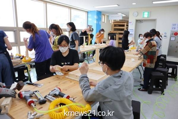 ▲ 사진=장성군청장성군 드림스타트가 지난 11일 아동 및 학부모 25명을 대상으로 ‘뚝딱뚝딱 목공프로그램’을 진행했다.