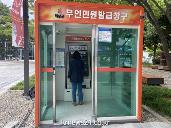 군청 무인민원발급기는 그동안 해남군민광장 조성공사로 인해 군청 로비에 임시 운영되어왔다. 야외인 군민광장으로 이전함으로써 야간과 공휴일에도 365일 24시간 언제든지 민원서류 발급이 가능해 민원접근성과 주민만족도가 개선 될 것으로 기대된다.