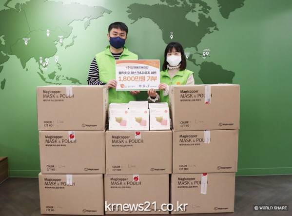 ▲ 사진=월드쉐어국제구호개발 NGO 월드쉐어(이사장 박현모)는 알앤에프케미칼(대표이사 박동일)이 1800만원 상당의 다회용 항균·항바이러스 마스크 세트를 기부했다고 밝혔다.