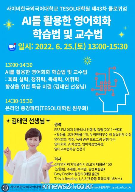 이번 온라인 콜로퀴움 특강은 EBS 라디오 ‘이지 잉글리시’ 진행자인 김태연 강사가 진행한다. 김태연 강사는 인공지능(AI)을 활용한 영어 회화 학습 및 교육 방법을 소개하고 영어 회화 능력 및 청취력, 독해력, 어휘력 향상을 위한 특급 비결을 공유할 예정이다.