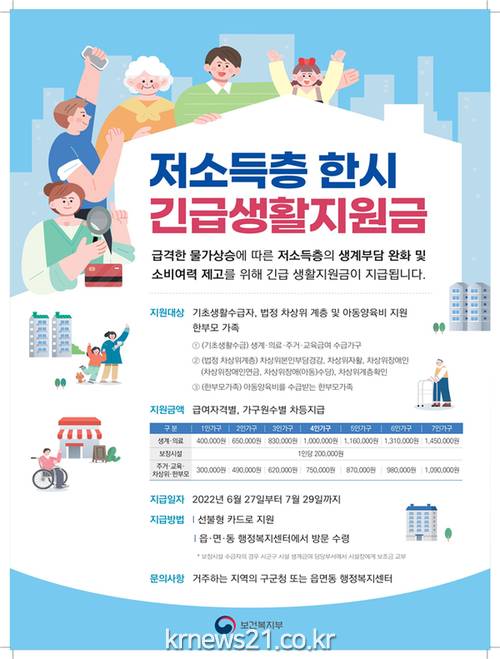 울산시 관계자는 “저소득층 한시 긴급생활지원금이 코로나19 이후 급격한 물가 상승으로 어려움을 겪고 있는 저소득층의 생계부담을 덜어줄 수 있고 지역경기침체 회복에 도움이 되기를 기대한다.”라고 밝혔다.
