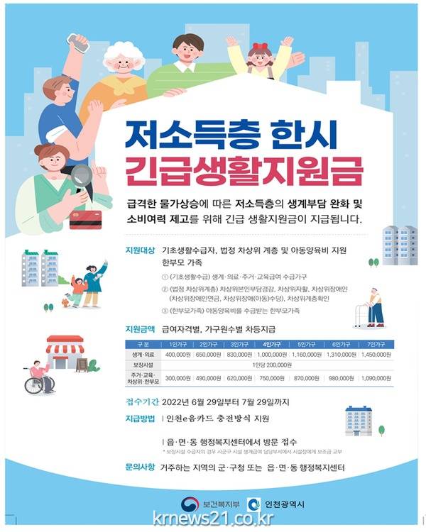 ▲ 사진=인천광역시인천광역시는 최근 급격한 물가상승에 따른 저소득층의 생계 부담을 덜고 소비 여력을 높이기 위해 이달 29일부터 한시 긴급생활지원금을 지급한다고 밝혔다.