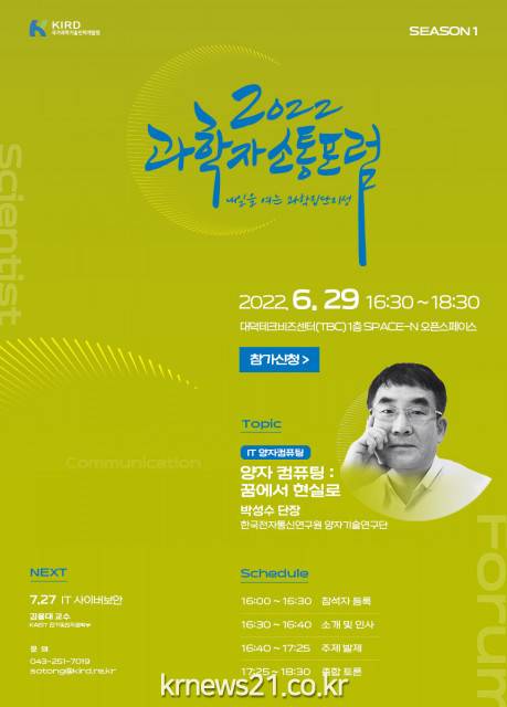 ▲ 사진=국가과학기술인력개발원국가과학기술인력개발원(원장 박귀찬, 이하 KIRD)은 차세대 선도기술 연구성과를 공유하고 융합연구 촉진을 위한 ‘2022년 제3회 과학자 소통 포럼’을 29일 대전 대덕테크비즈센터에서 개최한다고 밝혔다.