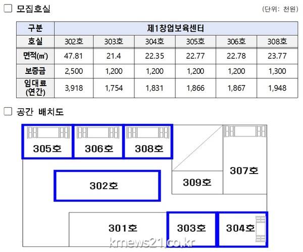 입주 공간은 제1창업보육센터(마들로11길 20, 농협창동유통센터 3층) 6개 호실이며, 최초 1년 계약 후 1년마다 연장하는 방식으로 최장 3년까지 입주 가능하다. 모집 호실에 따른 면적과 보증금, 연간 임대료 등 자세한 사항은 도봉구 홈페이지 ‘고시 공고’란에서 확인할 수 있다.
