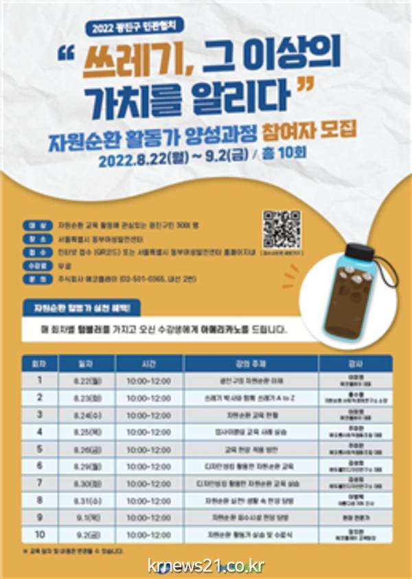 자원순환 교육 활동에 관심 있는 광진구민은 QR코드로 접수하거나 유선 접수도 가능하다. 참가 신청 및 커리큘럼 등 자세한 사항은 사업 담당(☎02-501-0365)에게 문의하면 된다.