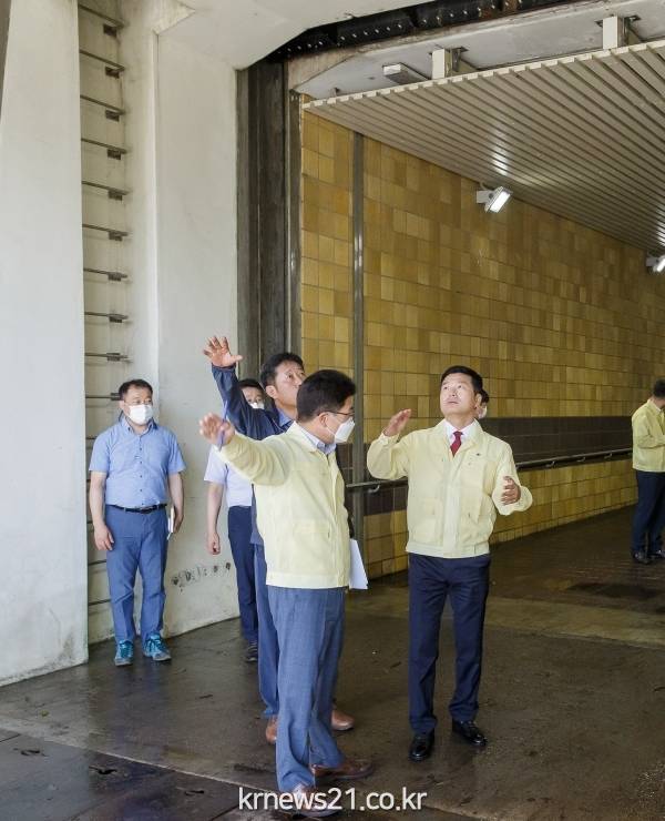 김 구청장은 현장에서 육갑문 시설을 둘러보고 집중호우로 인한 피해 상황에 대한 보고를 받았다. 특히, 수문을 올리거나 내리는 기계인 권양기의 정상작동 여부 등 육갑문 시설 상태를 꼼꼼히 살폈다.