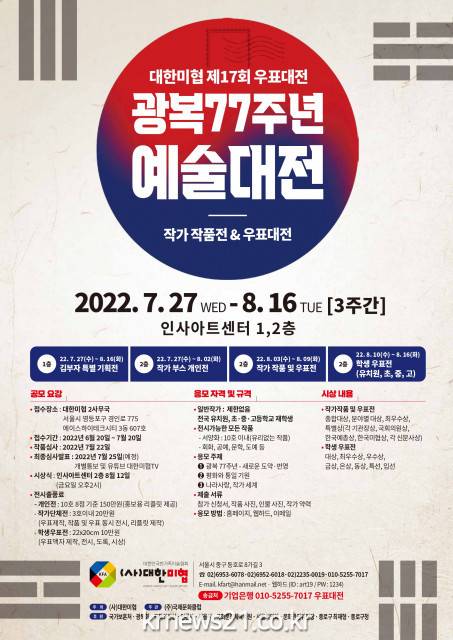 ▲ 사진=국제문화클럽광복 77주년을 맞아 사단법인 대한민국한가족미술협회가 주최하고, 국제문화클럽이 주관하는 학생 우표대전과 예술대전이 열린다.