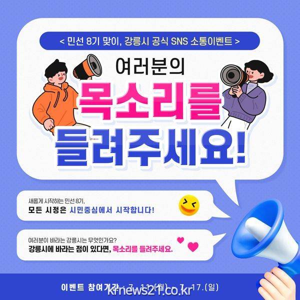 ▲ 사진=강릉시 페이스북강릉시는 11일(월)부터 17일(일)까지 강릉시 SNS채널인 페이스북과 인스타그램을 통해 댓글로 시민 의견을 받는 소통이벤트「여러분의 목소리를 들려주세요!」를 추진한다.