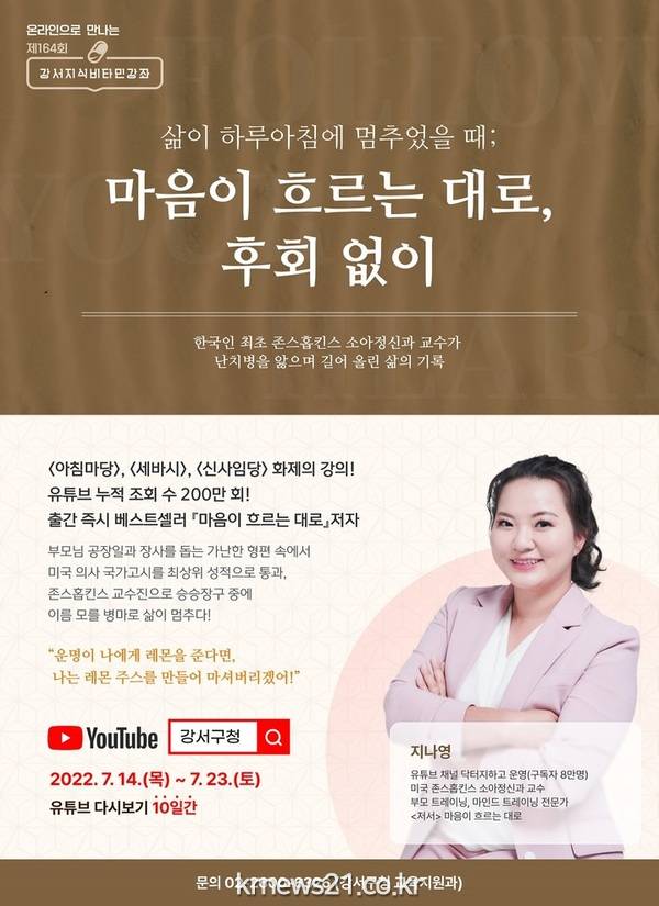 ▲ 사진=강서구서울 강서구(구청장 김태우)는 제164회 온라인 강서지식비타민 강좌 ‘마음이 흐르는 대로, 후회 없이’를 개최한다고 밝혔다.