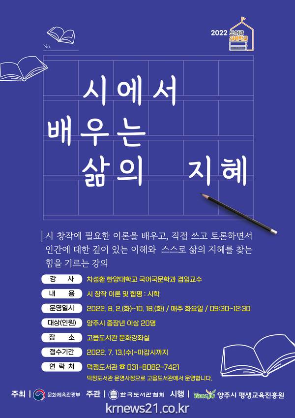 ▲ 사진=양주시양주시 고읍도서관은 ‘시에서 배우는 삶의 지혜’강좌에 참여할 수강생 중장년층 20명을 모집한다고 밝혔다.