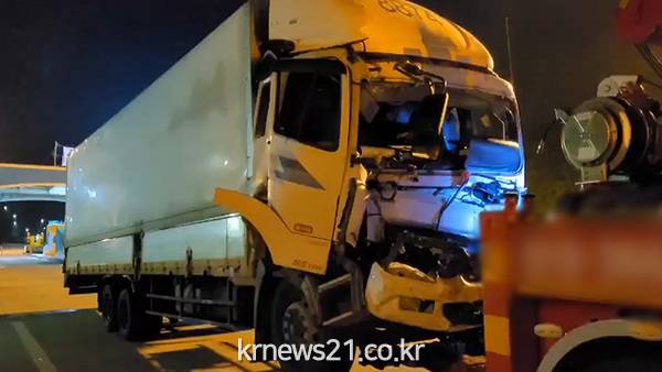 ▲ 사진=KBS NEWS어젯밤(18일) 11시 15분쯤 청주-영덕 고속도로 충북 보은군 회인 나들목 부근을 달리던 8톤 화물차가 정차 중이던 화물차와 승용차 등 차량 2대를 잇따라 들이받았다.