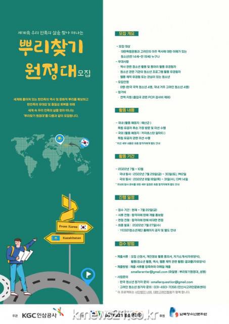 KGC인삼공사가 주관하고 남북청소년문화원이 후원하는 이번 프로젝트는 시대와 세대의 변화 속에서 사라져 가는 국외 지역 한민족의 역사와 문화적 뿌리를 확보하고, 동질성을 회복하기 위해 기획됐다.