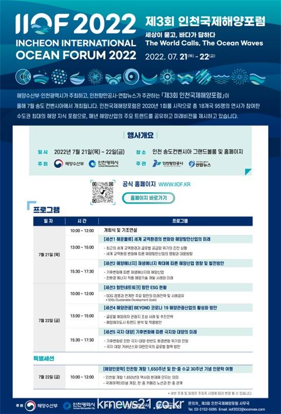 인천광역시(시장 유정복)는 해양수산부, 인천항만공사, 연합뉴스와 공동으로 개최하는 ‘제3회 인천국제해양포럼(Incheon International Ocean Forum 2022)’ 개막식을 개최했다고 밝혔다. 포럼은 7월 21(목)부터 7월 22일(금)까지 양일간 송도컨벤시아에서 개최된다.