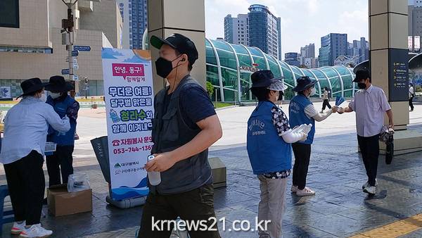대구광역시, 동구청, 동구자원봉사센터와 함께하는 이번 “폭염극복 행사”는 동대구역광장을 이용하는 대구시민과 대구를 찾는 방문객을 대상으로 폭염 대응 행동요령을 홍보하고 시원한 청라수 (병입 수돗물), 양산, 부채 등 폭염 예방 물품을 배부한다.