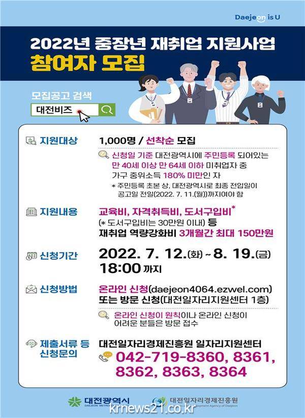 시는 총 1,000명을 모집할 계획이며, 내달 19일까지 대전 중장년 재취업 지원사업 홈페이지(daejeon4064.ezwel.com)를 통해 온라인으로 신청할 수 있다. 온라인 신청이 어려운 경우 대전일자리지원센터에서 방문 신청도 가능하다.
