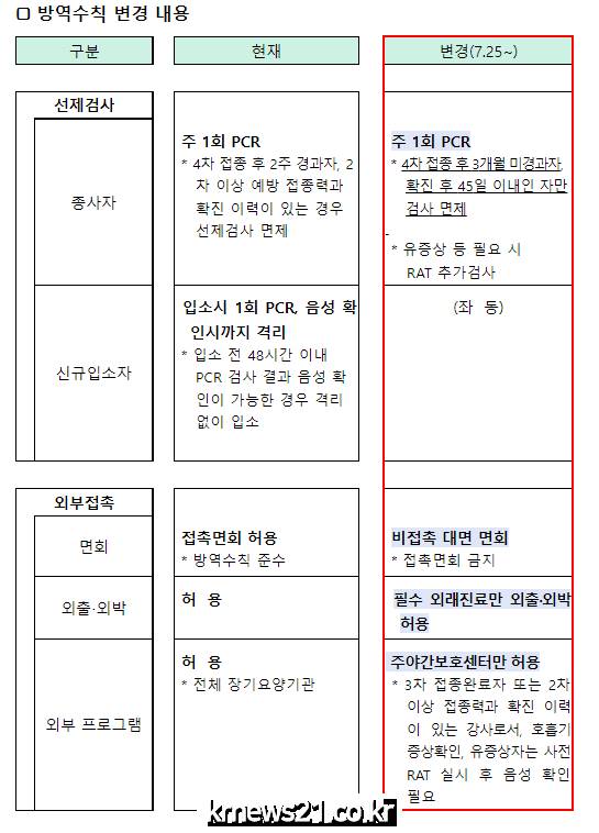 또한 대면 면회는 비접촉 대면 면회로 전환하고, 입소자의 외출·외박은 필수 외래진료만 허용되며, 외부 프로그램은 전체 시설에서 주야간보호센터에 한해 허용한다.
