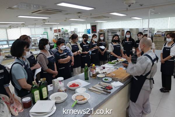 서울 영통사 보전스님과 함께한 이번 교육은 사찰음식 요리법 연구라는 주제로, 육식을 선호하는 학생들의 식습관 및 채식에 대한 인식 개선을 위해 관내 농산물과 제철 식재료를 이용해 추진됐다.