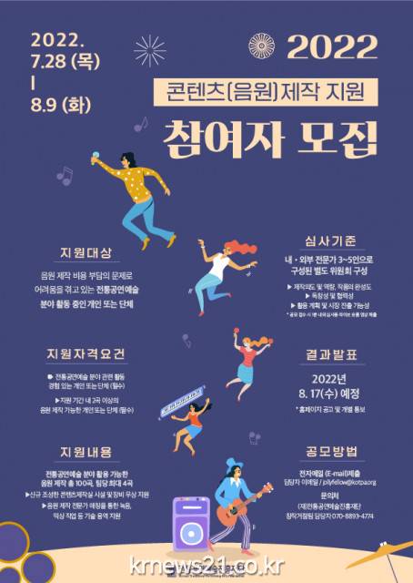 ▲ 사진=전통공연예술진흥재단전통공연예술진흥재단(이사장 김삼진)은 코로나19 이후 활동과 수입이 감소하며 창작활동에 어려움을 겪는 전통 분야 예술인들을 지원하고자, ‘2022 전통공연예술 콘텐츠 제작 지원’ 사업의 하나로 전통공연예술 분야 콘텐츠(음원) 제작 지원 참여자 공모를 진행한다.