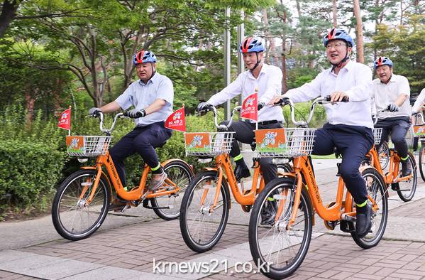대전시는 25일 시청남문 광장에서 이장우 시장, 이상래 시의회 의장, 조원휘 시의회 부의장, 김진오 시의회 부의장, 시의회 산업건설위원회 의원, 자전거 동호회원 들이 참석한 가운데 시승행사를 개최하고 타슈 시즌2 도입을 시민들에게 알렸다.