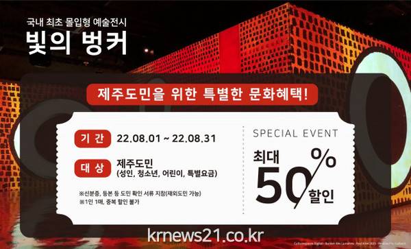 이번 할인 이벤트는 제주에서 국내 미디어아트의 포문을 연 빛의 벙커가 개관 이후 지속적인 관심과 응원을 보내 준 제주도민들에게 보답하고 이들의 문화 여가 생활을 지원하기 위해 특별히 기획됐다.