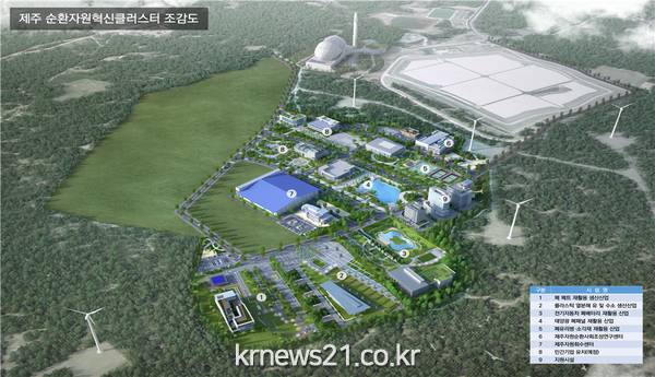 제주 자원순환클러스터는 폐플라스틱·비닐 및 폐배터리·태양광 패널 등 미래 폐자원의 재활용 산업 육성을 위한 연구·실증·산업을 집약한 일반산업단지로, 제주시 구좌읍 동복리 일원에 총 사업비 495억 원을 투입해 22만 7,061㎡ 규모로 조성된다.