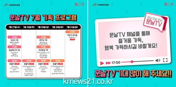 ‘문화가 있는 날’ 사업 담당자는 “온라인 문화플랫폼 문날TV로 국민들이 손쉽게 전국에서 펼쳐지는 문화가 있는 날 정보와 생생한 현장을 누리길 바란다”고 밝혔다.