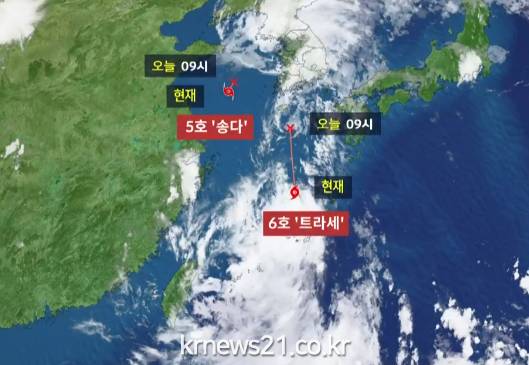 ▲ 사진=KBS NEWS 캡처서해 상에서 북상 중인 5호 태풍 '송다'에 이어 6호 태풍 '트라세'가 발생해 제주도 부근으로 북상하고 있다.