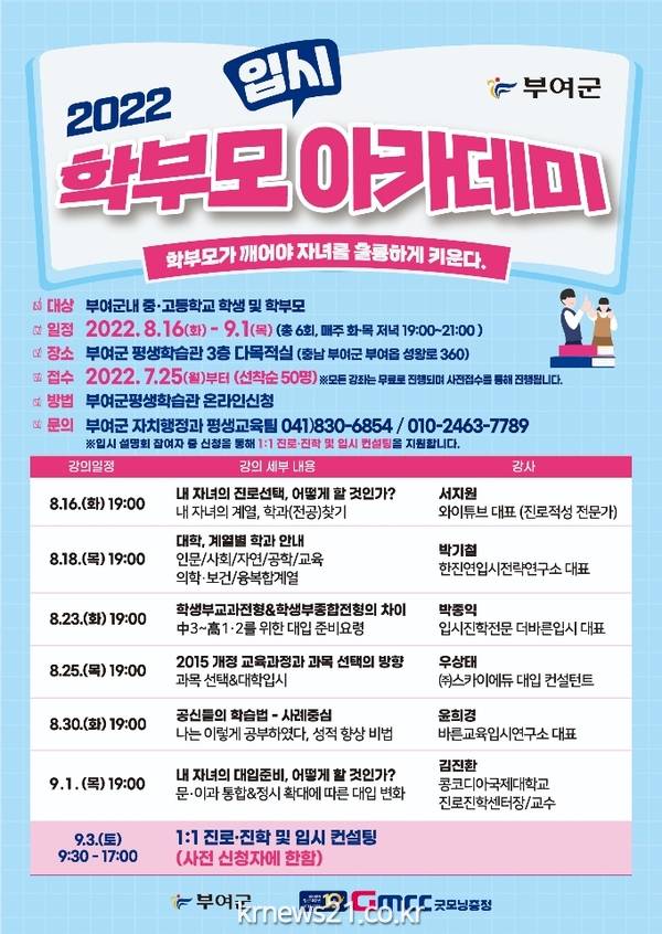 ▲ 사진=부여군(재)부여군굿뜨래장학회(이사장 박정현)는 관내 중·고등학교 학생과 학부모를 대상으로 ‘2022년 학부모 입시 아카데미’ 참여 희망자를 선착순으로 모집한다.