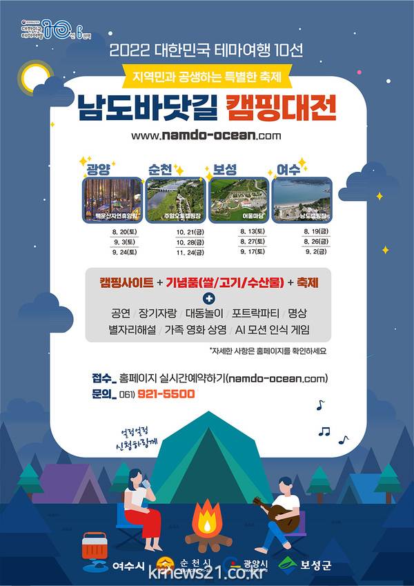 참가 신청은 남도바닷길 캠핑대전 홈페이지(www.namdo-ocean.com)에서 선착순으로 실시간 예약 가능하다.