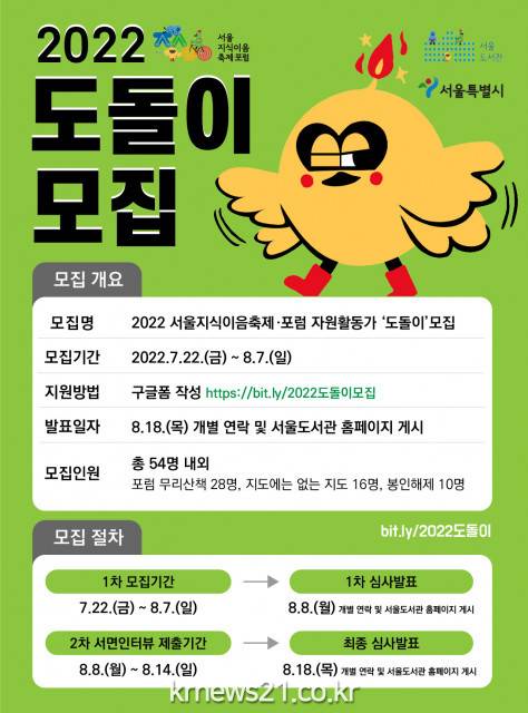 ▲ 사진=서울도서관서울도서관이 8월 7일까지 ‘2022 서울지식이음축제·포럼’의 시민 활동가 ‘도돌이’ 54명을 모집한다.
