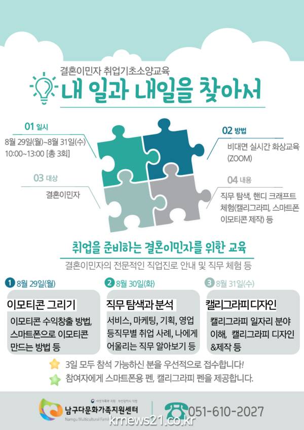 ▲ 사진=부산광역시부산시 여성회관은 오는 8월 29일부터 31일까지 매일 오전 10시마다 결혼이민자 대상 비대면 취업기초소양교육 「내 일과 내일을 찾아서」를 개최한다고 밝혔다.